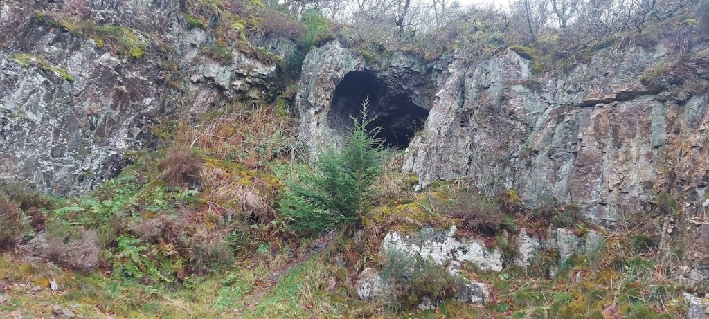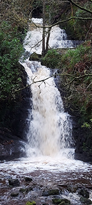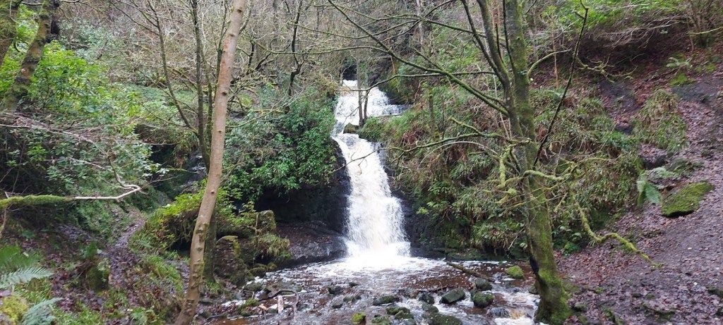 The path led us further down the valley leaving the conifers behind into a deciduous woodland. We could hear the rushing of the water from the waterfall so we knew that it was close by. There is a small cave on the side of the path that I had a quick sniff around. We soon came to a point where we could see the base of the waterfall through the trees. A few moments later we could see the entire falls. The three tier falls looked stunning after the recent rain. My human took his photographs while I had a mooch around the undergrowth. Once he was satisfied we retraced our steps along the muddy, slippery tree-root strewn footpath.