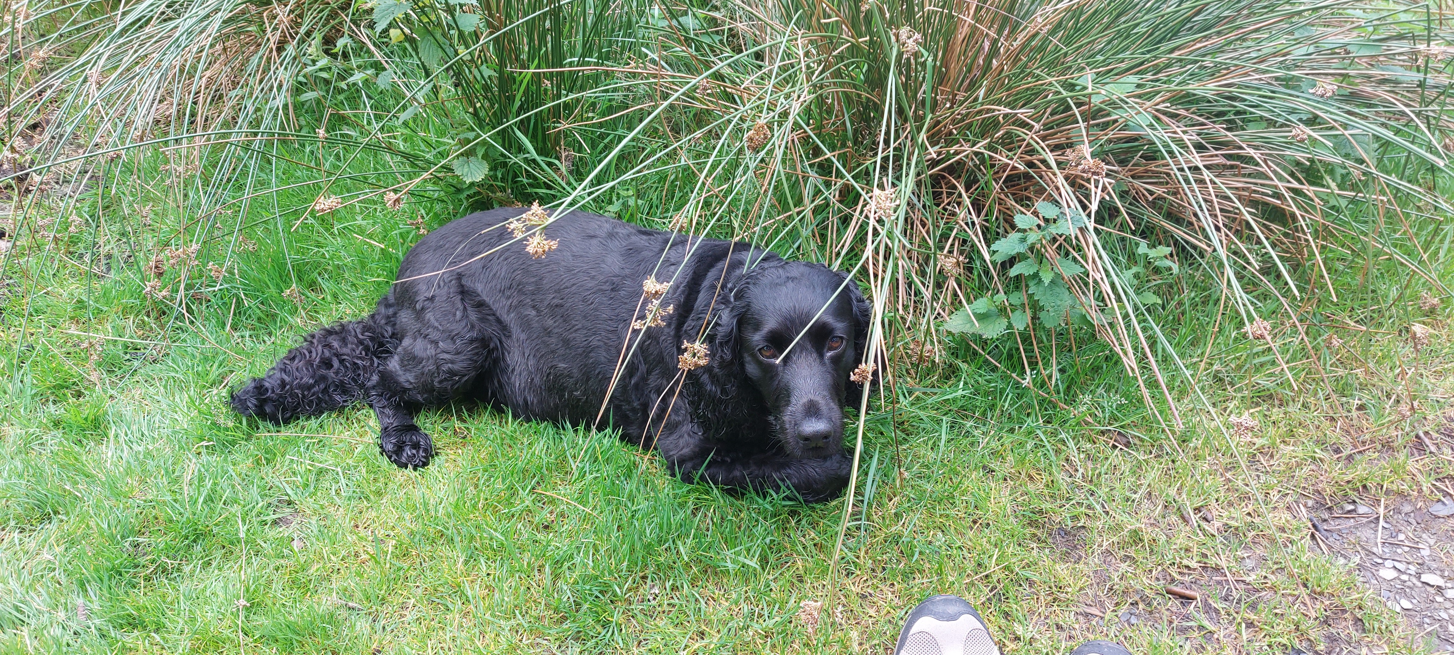 Just as we reached the southern tip of the lake, we found a bench overlooking Llyn y Gadair and presumably up Yr Wyddfa on a clear day. I always ask my human if he wants to stop when I find a bench. This is for three reasons. One reason is that he always tells me what a good boy I am. The second reason is that he is old and overweight. The third and most important reason is that when he stops at a bench, he always has something to eat, and that’s when I get my treats. He hasn’t worked that out yet. He just thinks that I am a good boy. He is a pushover and in my metaphorical pocket!