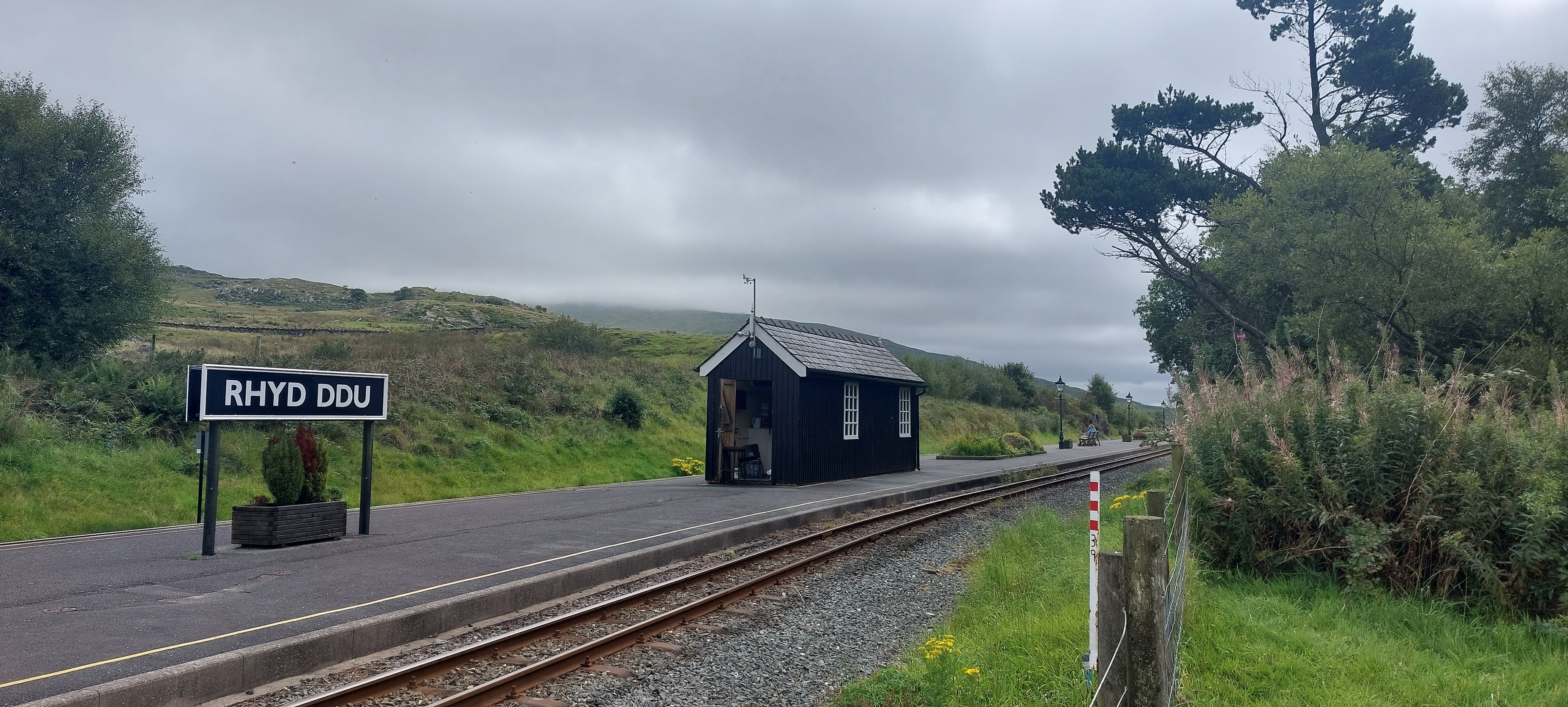 The valley opened up ahead of us, and the walk was quite flat on mainly loose stones. A lot of the path was fenced off from the sheep grazing areas, so I could still have some freedom. That was until we were at the side of Llyn y Gadair, where we came to a number of gates. The remains of the Llyn y Gadair quarry were on our left as we joined the causeway that avoids the boggy western edge of the lake. We crossed the Afon Gwyfrai and entered the small settlement of Rhyd Ddu. We walked up to the station on the Welsh Highland Railway by the start of the Rhyd Ddu path up Yr Wyddfa (Snowdon). This would be our turning point to head back to Beddgelert.
