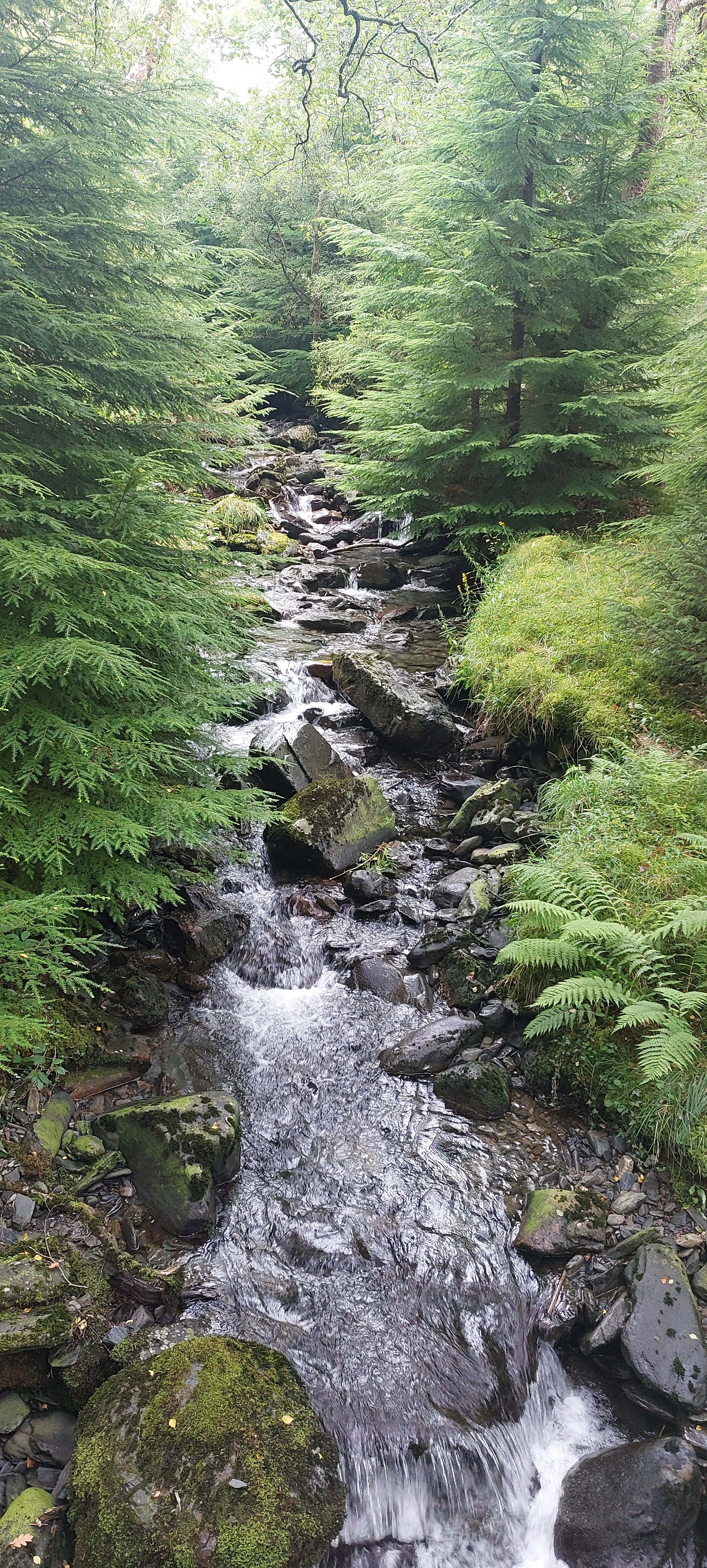 There was a mixture of sections of the walk that I could run off-lead and sections where there was sheep grazing where I had to stay on-lead. I don’t mind as I am used to this. The views of the surrounding hills and valleys were obscured by clouds, and rain looked likely. I don’t mind that either. I’m more interested in sniffing in the bushes anyway. We were soon in Beddgelert Forest, where I could concentrate on searching for squirrels and birds. I found streams to run through and ferns to hunt in. Forests are my favourite playgrounds.
