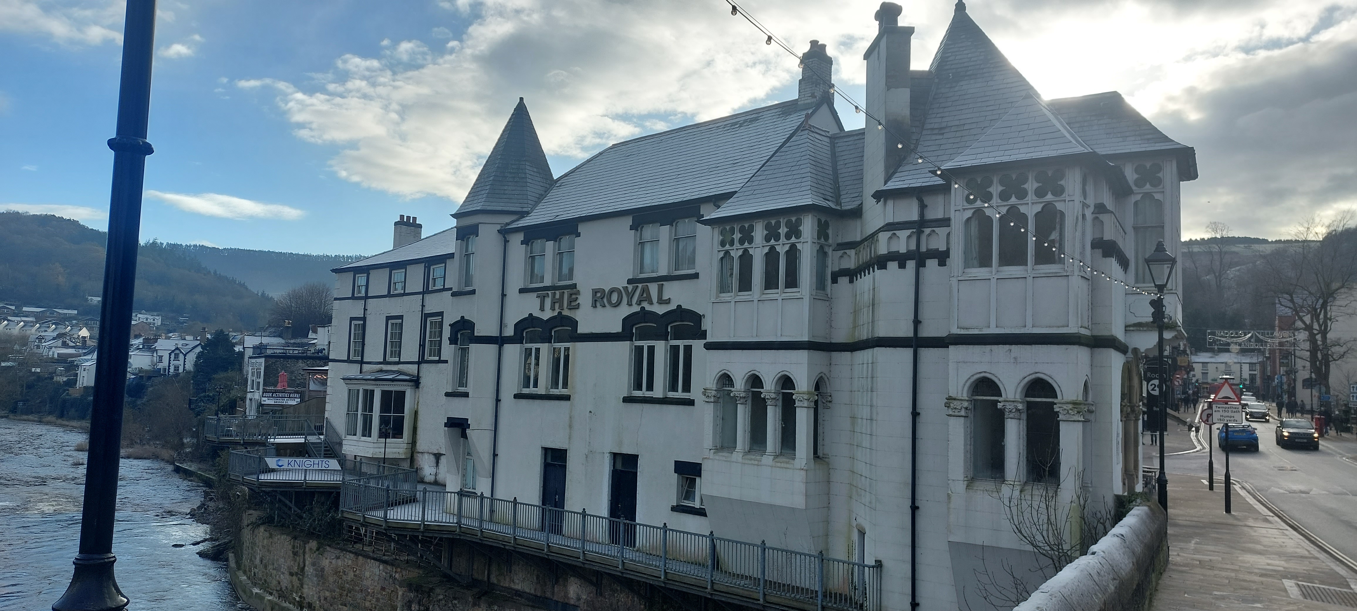 5. The wrought-iron detail can be seen on the canopy at the front of the Bridge End Hotel.