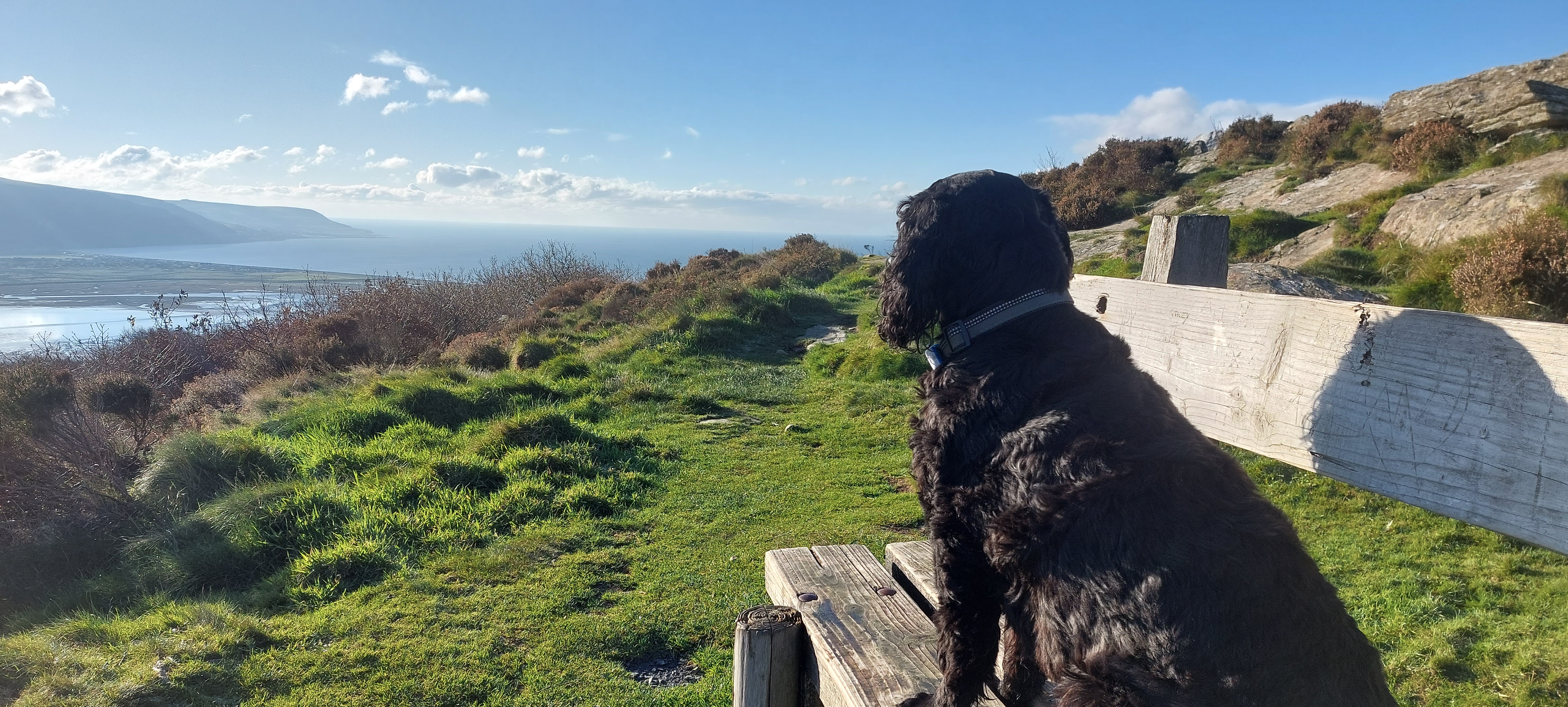 The sun was blinding as we stared out to see. We could clearly see the newly renovated Barmouth Railway Bridge spanning the mouth of the estuary. We spent half an hour on the top of the hill. My human forced me to sit on a bench and pose for photographs. I think that he was photographing the scenery, really. I felt like I was being used as eye candy!
