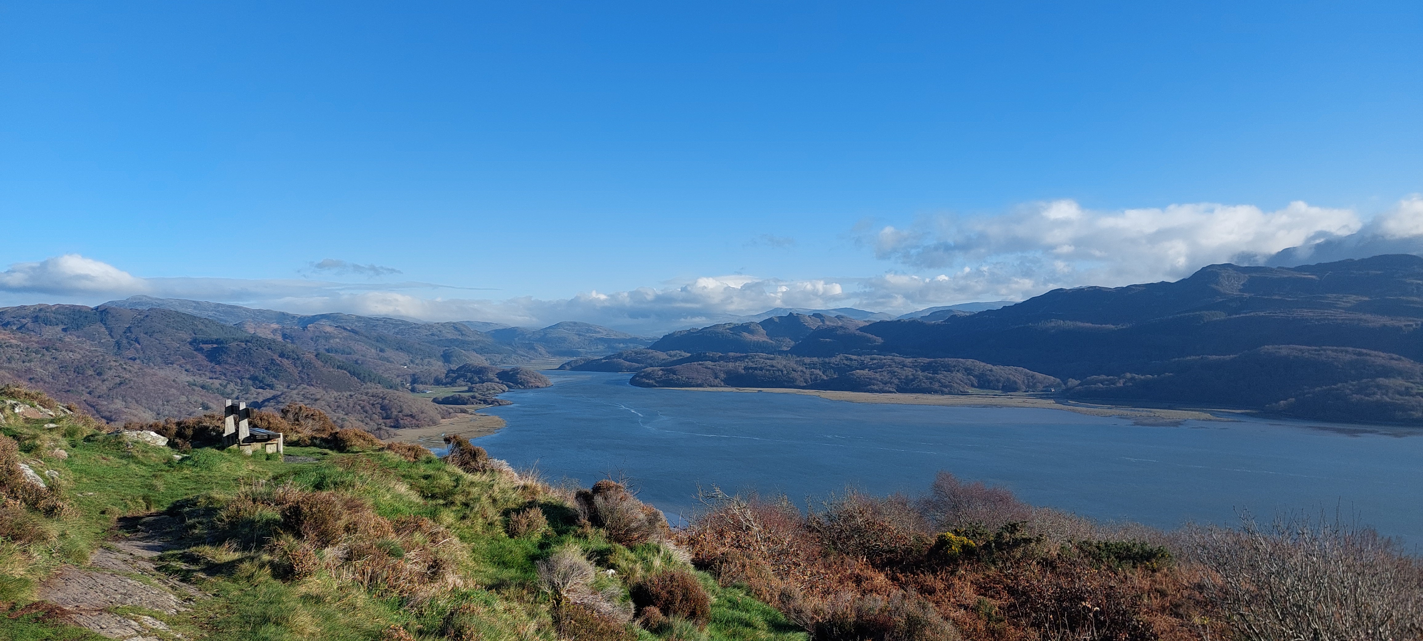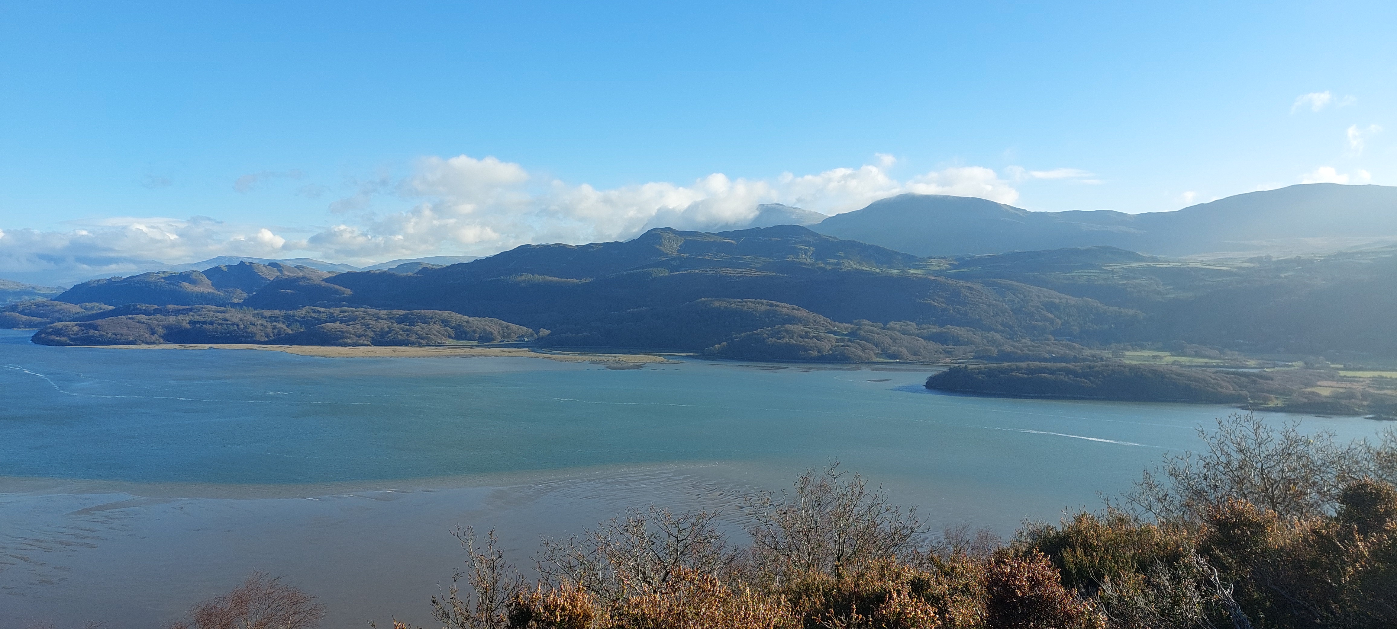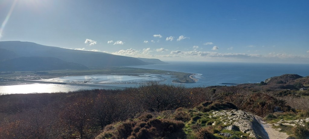 When we did reach the highest point on the walk, the view opened up in front of us. WOW! Even I was impressed. To our left, we could see the estuary narrowing as it became the Afon Mawddach near Penmaenpool. Ahead of us, we could see Cadair Idris with its own weather system of cloud poking above the foothills. To our right, we could follow the estuary as it opened up into the Irish Sea.