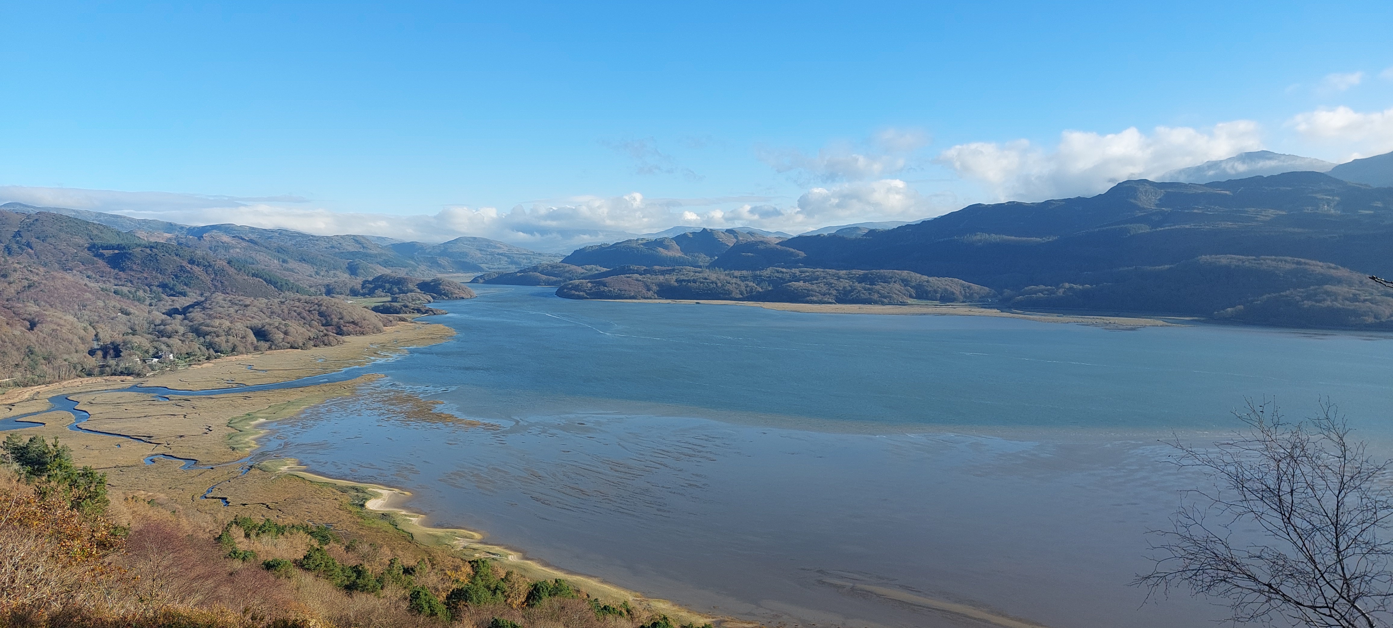 Hi again people and pooches. Joe the Cocker here reporting on another short walk that I finally persuaded my human to drive me to. The weather was amazing for early December. It was cold, dry, and sunny with only a slight breeze. We have always loved this area, but we have never walked on the northern shores of the Mawddach Estuary. There are a few waymarked walks on this side of the water, and we chose the shortest one for this little outing. After sampling the area, we have vowed to return soon to hike some longer walks.