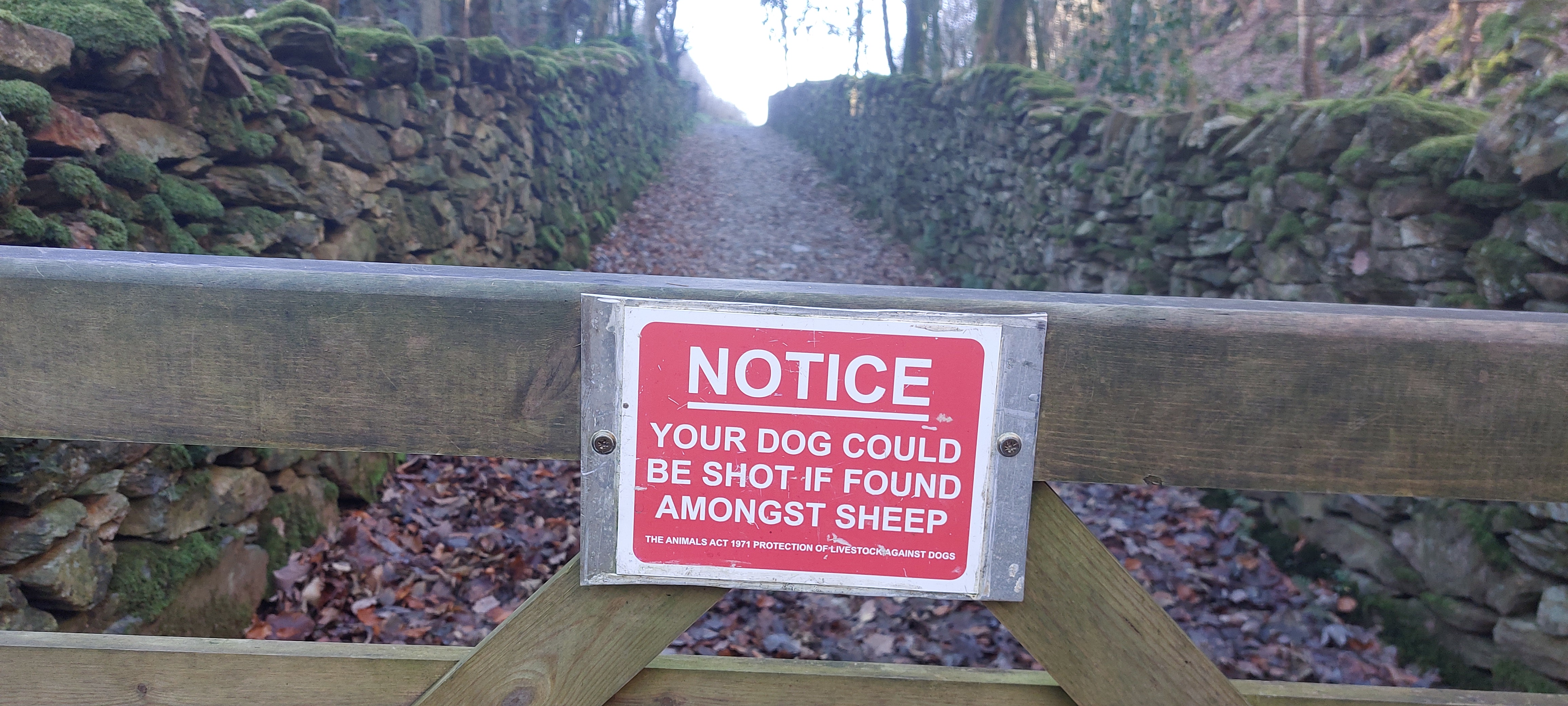We walked along an old dry-wall lined lane with a gate at its entrance. I was horrified to see that my life was being threatened. I hadn’t done anything, your honour! Anyway, the big feller always puts my lead on me when there is livestock around.