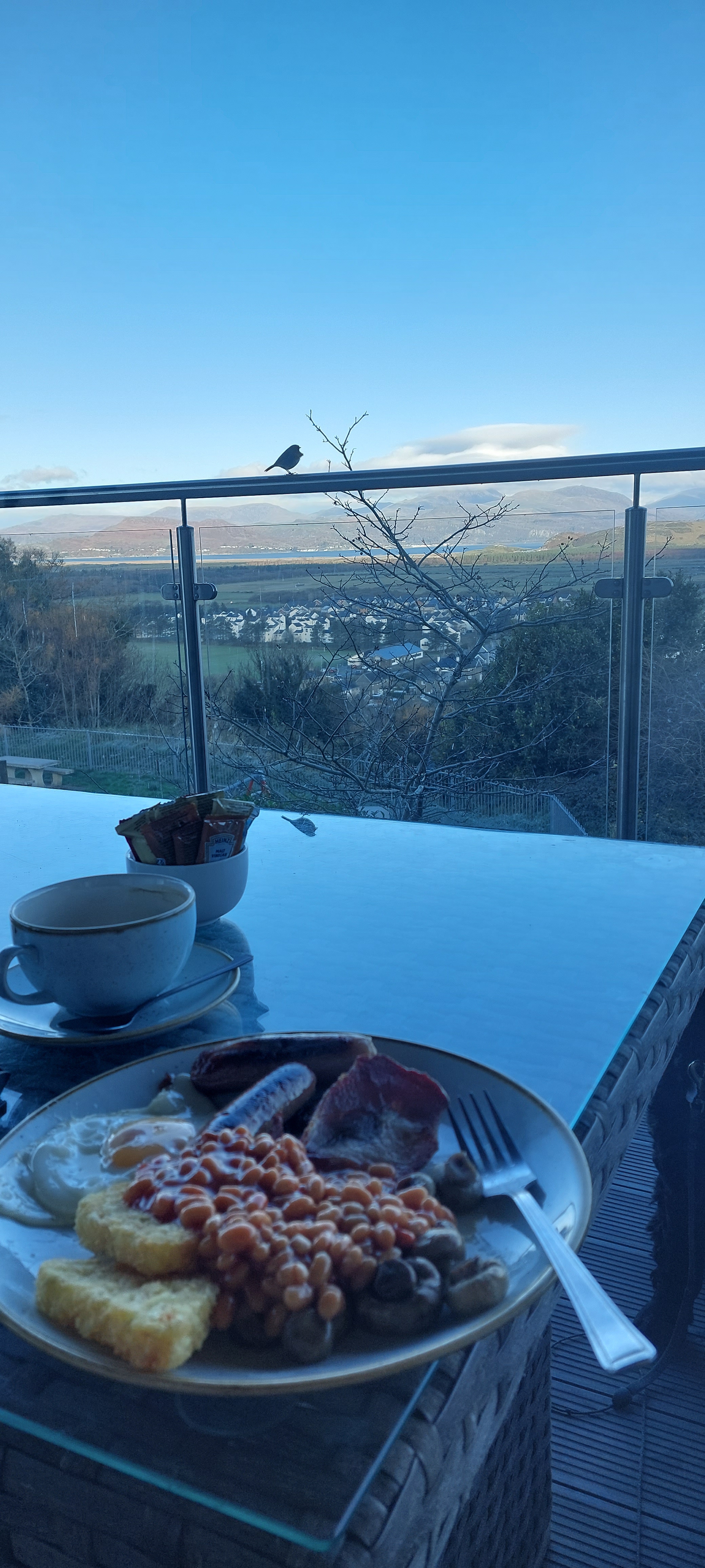 I think that my human had forgotten that we were sat outside, and it was -1C. I also think that he had forgotten that we were a few yards from one of the countries most iconic castles. He also appeared to have forgotten that the view from the terrace was absolutely stunning. All that he was concerned about was filling his face with his freshly cooked breakfast. Even the Robin that cheekily landed on the table a few inches away from me, an apex preditor! To be honest, I wasn’t really paying any attention to anything other than my humans breakfast. I could smell bacon, sausage, and a faint whiff of black pudding. After what seemed an age, I was given a few morsels of said meat products. If I am to be brutally honest, he gave me about as much as would keep that Robin alive for a few hours. He is dreadfully cruel to me!
