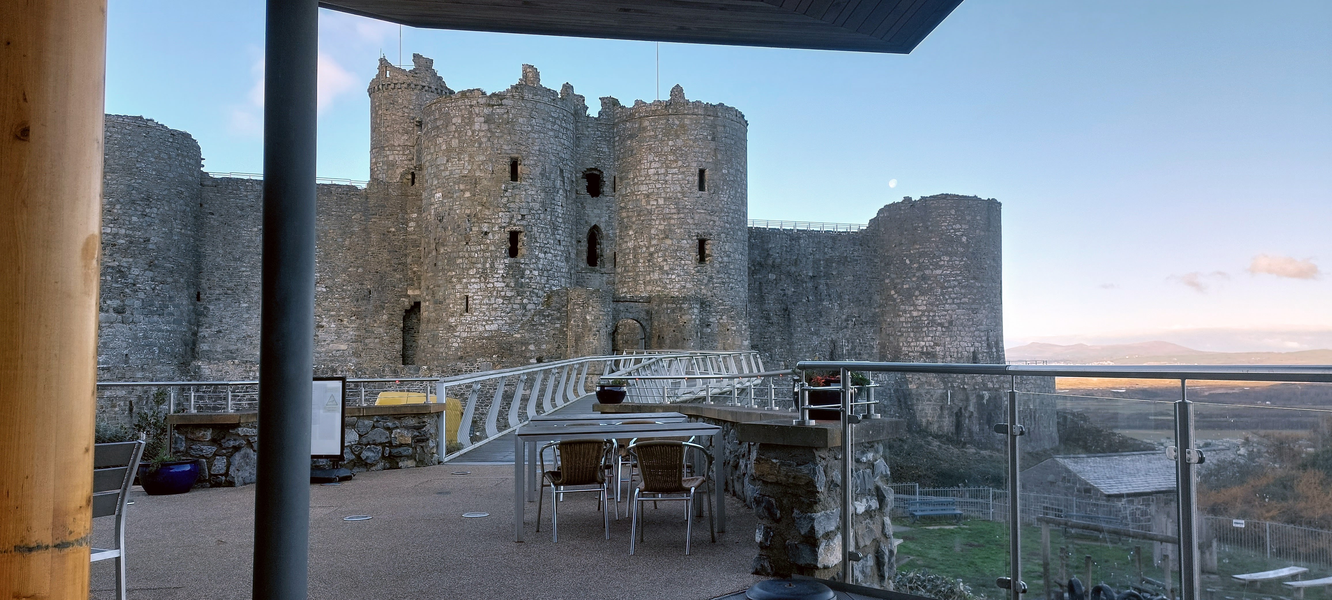 By the time we were at the top of the hill again, my lump of a human was out of breath and complaining that he was hungry. Before we left our accommodation in the morning, he had Google searched for a dog-friendly cafe in Harlech. He had found one that had an outdoor section that was dog-friendly, just outside of the castle grounds. It had good reviews and so he decided to have a look at it when we arrived. It was very cold, and a sub-zero light breeze was blowing. He took one look at the outdoor balcony of Caffi Castell Harlech and decided that we would definitely have breakfast there. Well, he would have breakfast and I would watch.