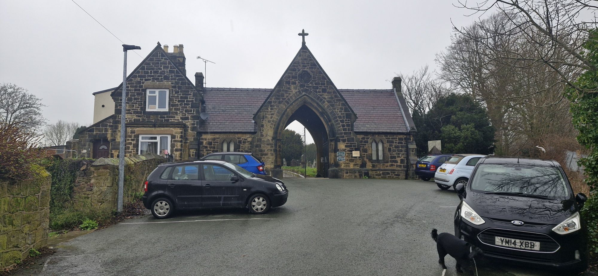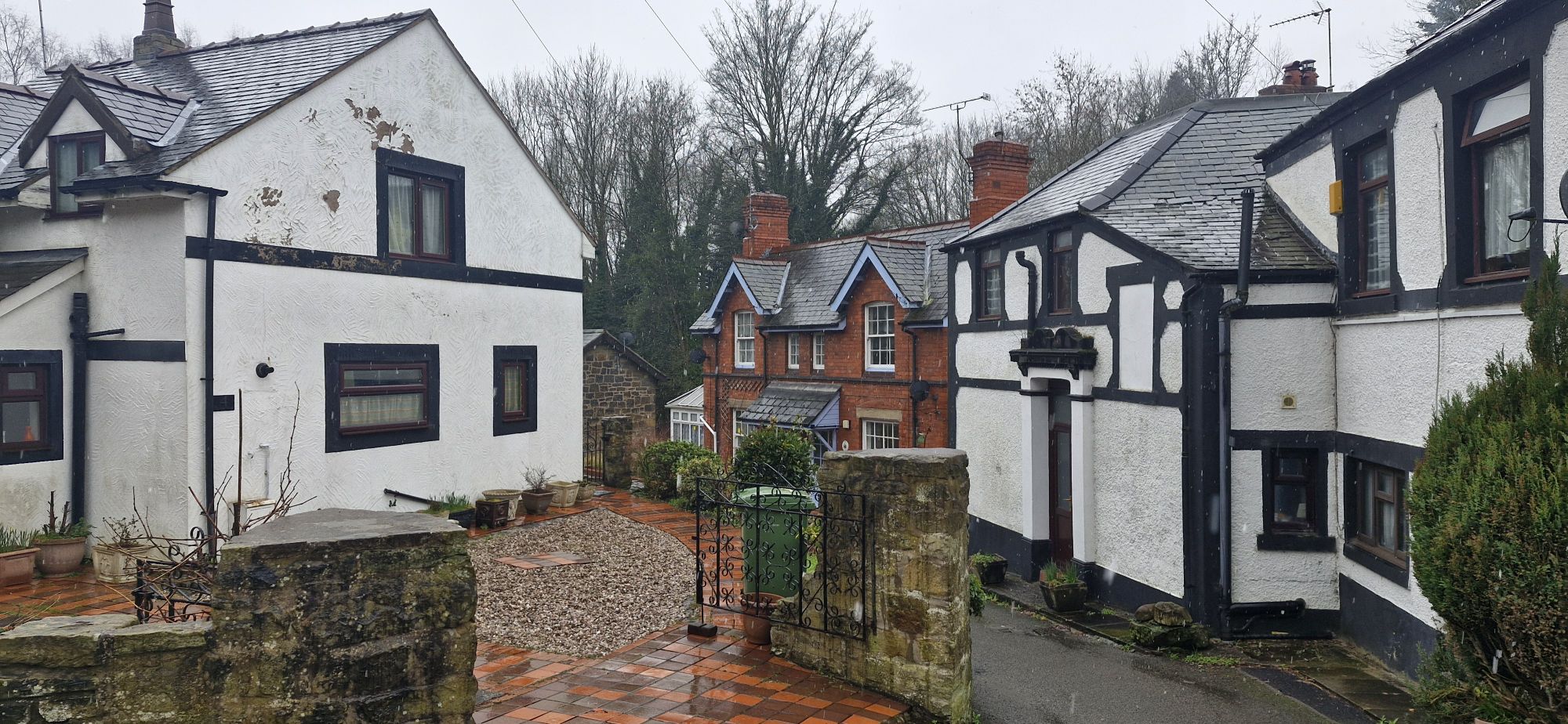 The lyche gate, just off the pavement, commemorates those fallen in the two World Wars. The street is within the Ruabon Conservation Area and contains a number of Grade ll listed buildings, including the much photographed Almshouses. Built in 1711 by Vicar Richard Davis to house the poor and are currently receiving some TLC.
