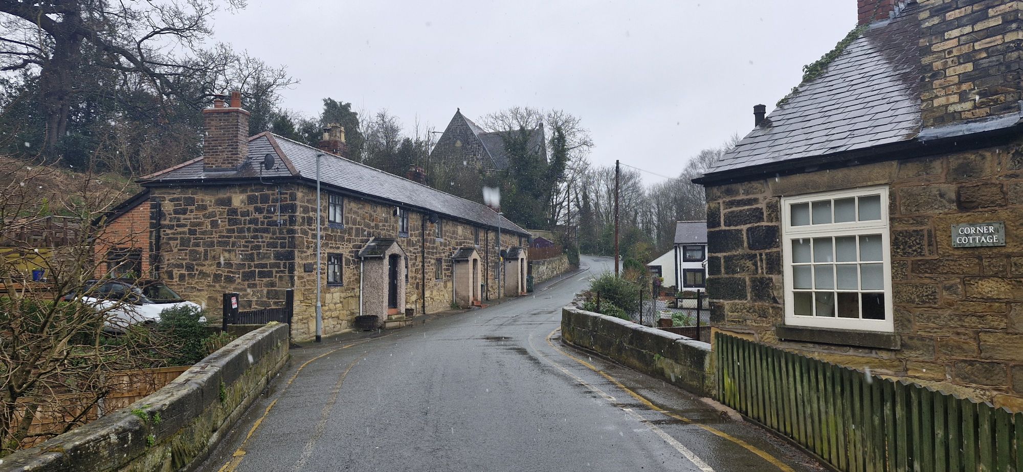 Further down the hill, we came across Pont Adam, the narrow bridge over the Afon Eitha. The original stone bridge was constructed in the 14th century by Abbot Adam of Vale Crucis Abbey near Llangollen. A house sits next to the bridge called Corner Cottage with a narrow lane, West End Terrace running behind.