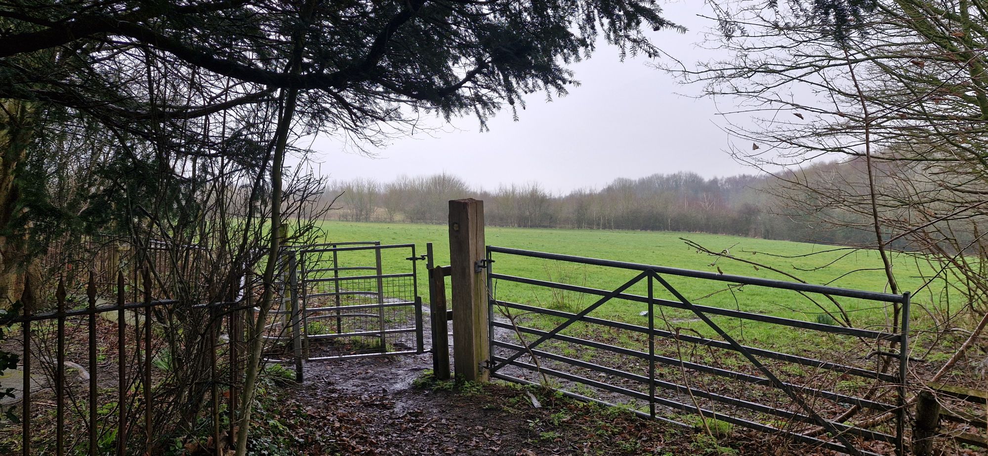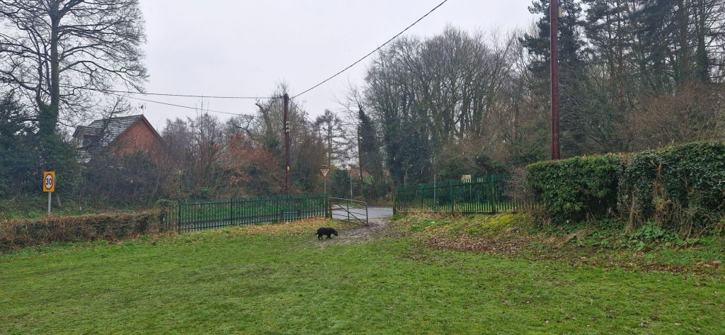 The path funnelled between hedgerows at the rear of houses on Tatham Road. We passed through two metal gates before we reached the roadside.