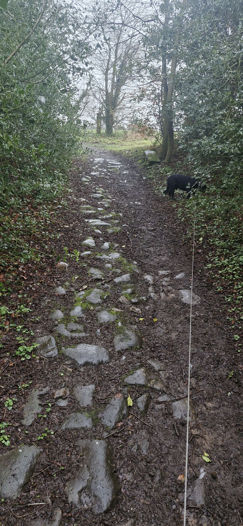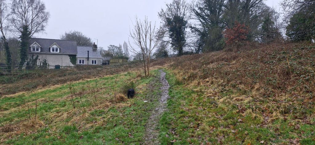 Just beyond ruined farm buildings and a gas storage yard, we headed up a rough muddy track with large stones embedded. The stones are supposed to make walking on the muddy track easier for humans and horses. Us pooches don’t need any help, but my human does. He slipped on one stone and almost face-planted. Only for some amazing acrobatics (unintentional) he would have hit the deck. Sometimes, I wish I had a camera.