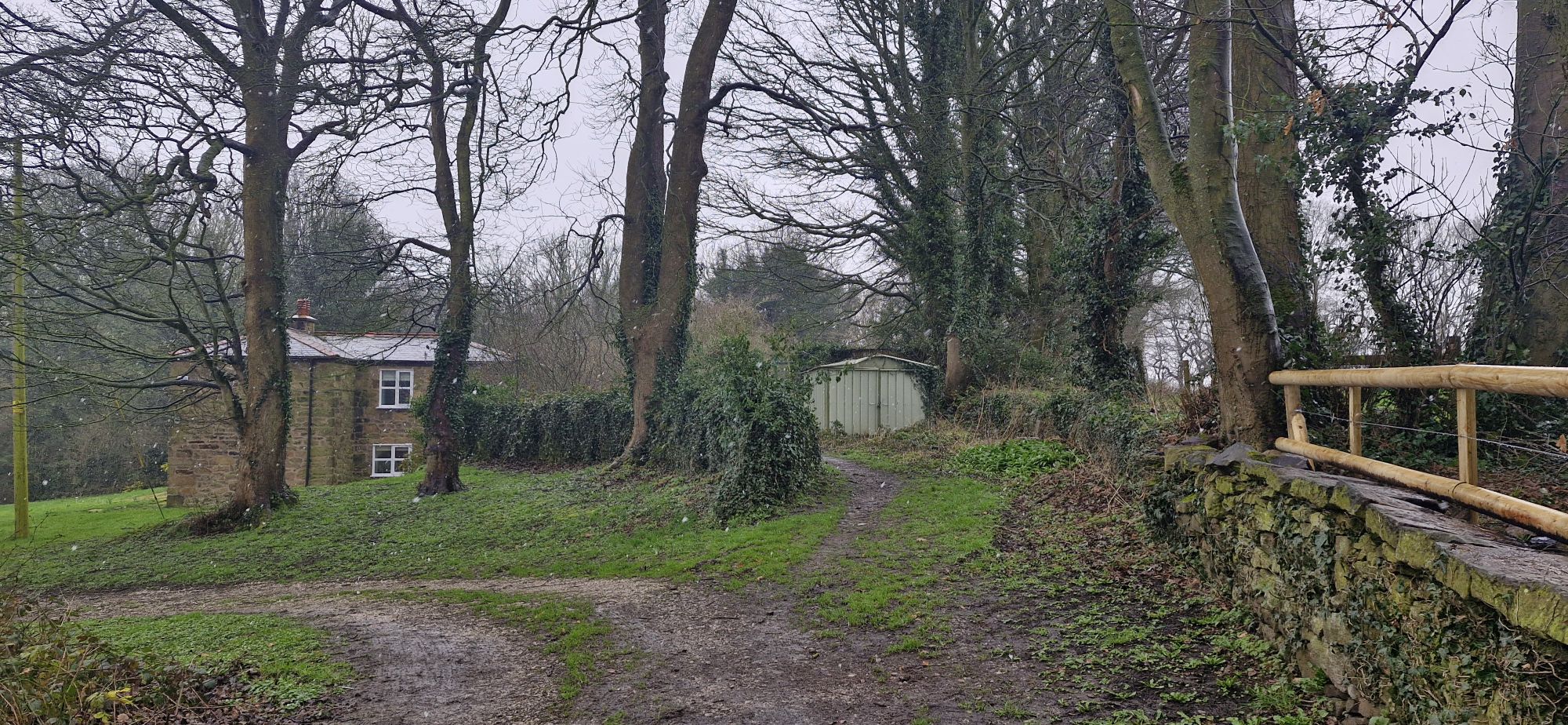 Beyond the houses, we took the right fork between a house and a metal garage that led into the woodland ahead.
