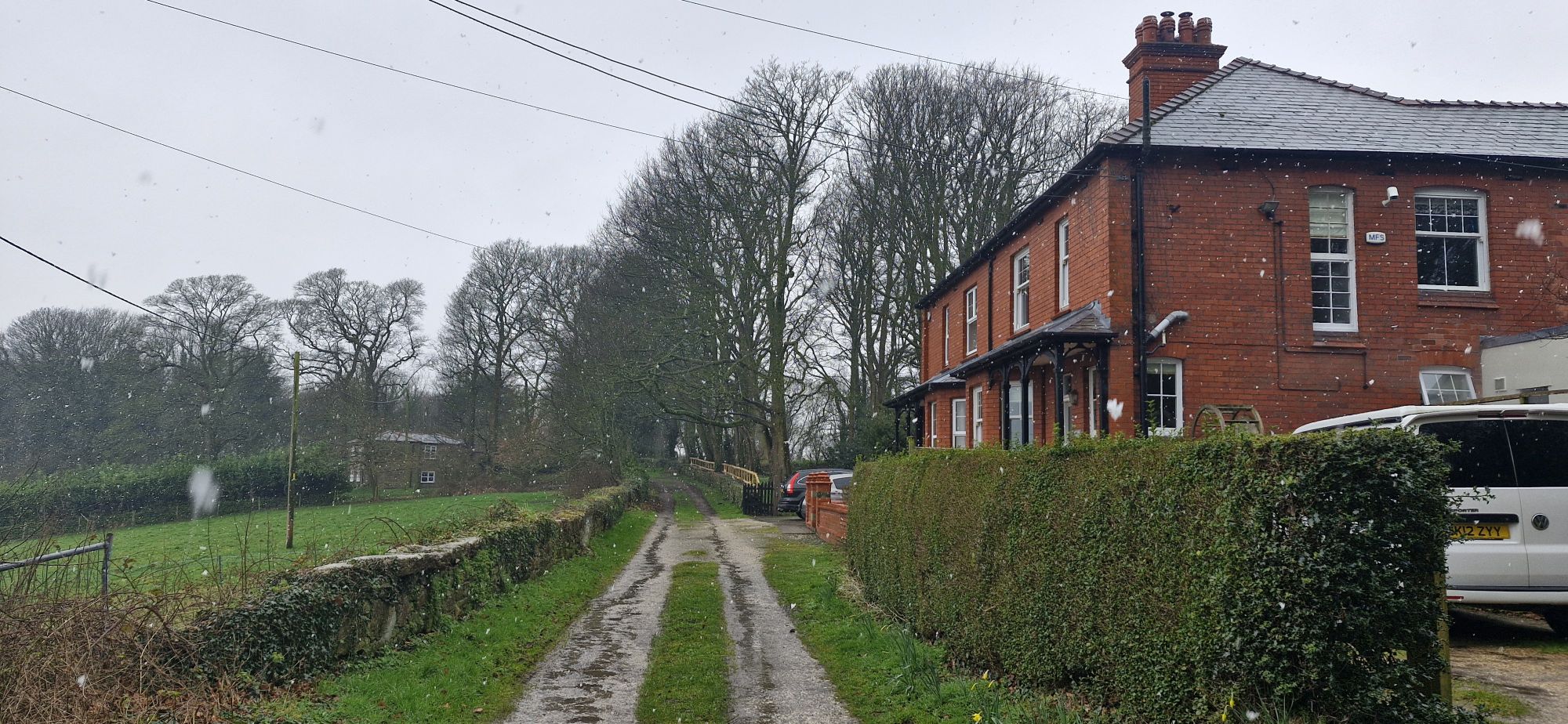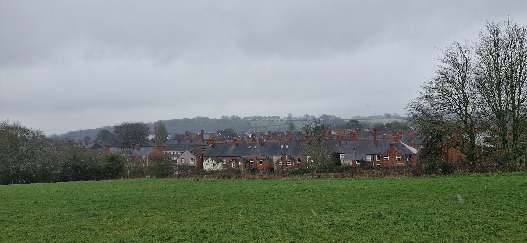 The track passed in front of a row of red brick houses that, on a brighter day, would command a sprawling view for miles over the countryside below.