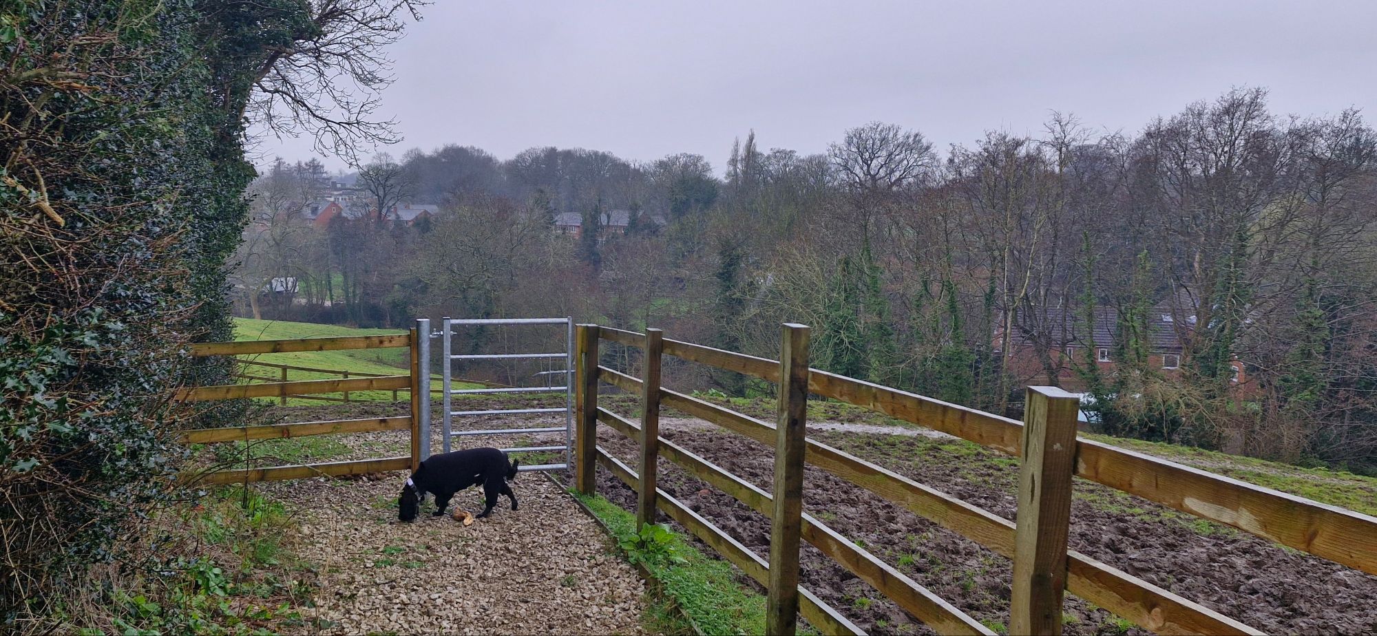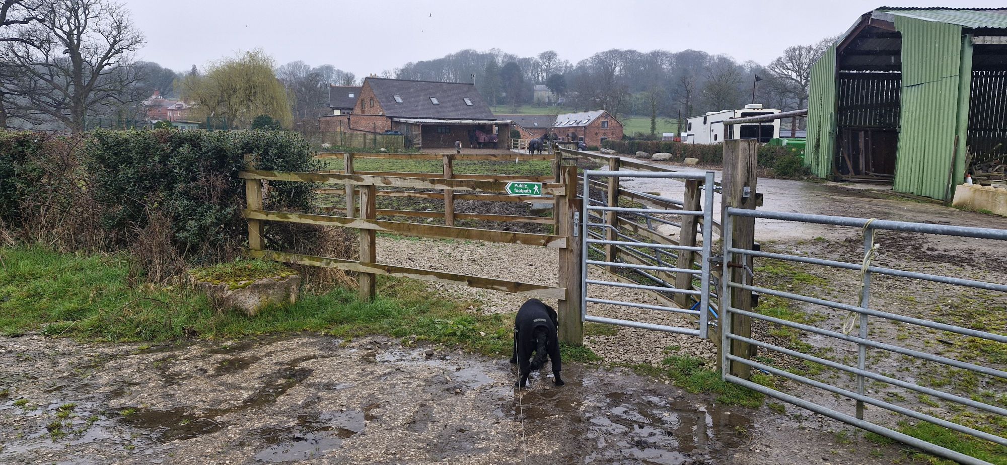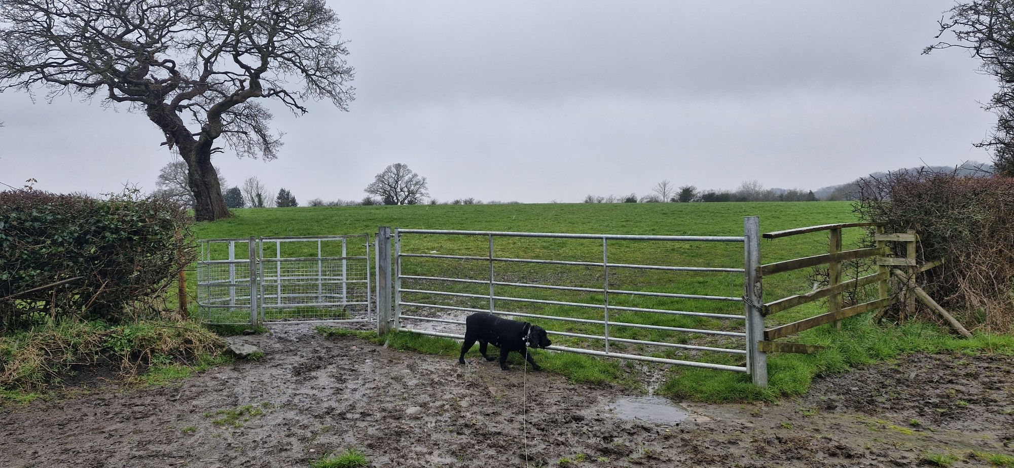 We soon reached a very muddy exit from the field at another metal gate. My human was tippy-toeing through the mud in his size 10 hiking boots. ‘Why?’ I asked myself. I ploughed straight through it in my bare paws!