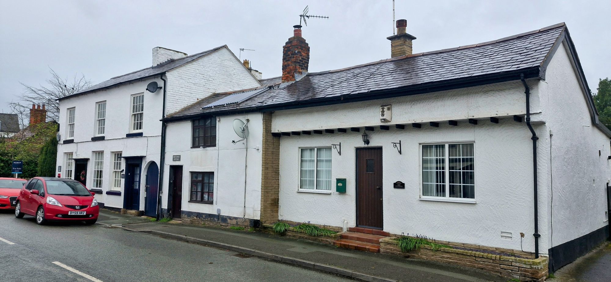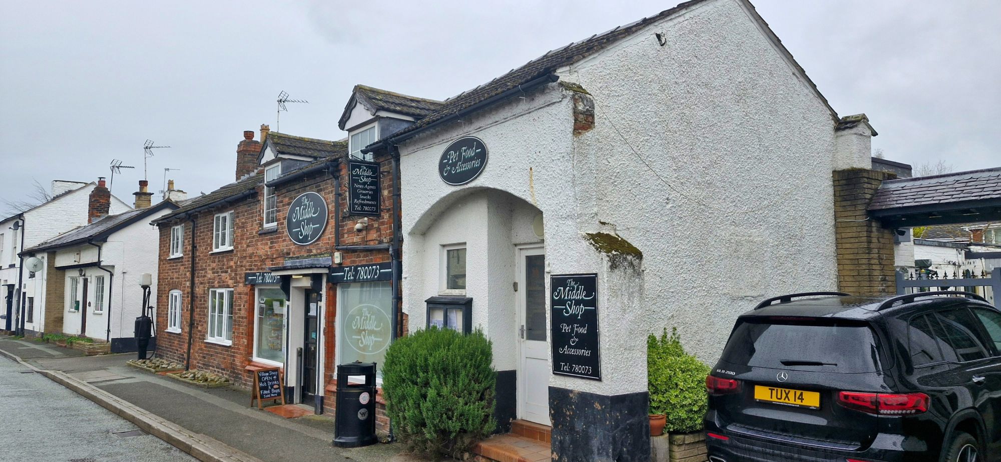 The three joined cottages in the row adjacent to the Post Office block are currently residential, a newsagent/grocery shop, and a pet shop.