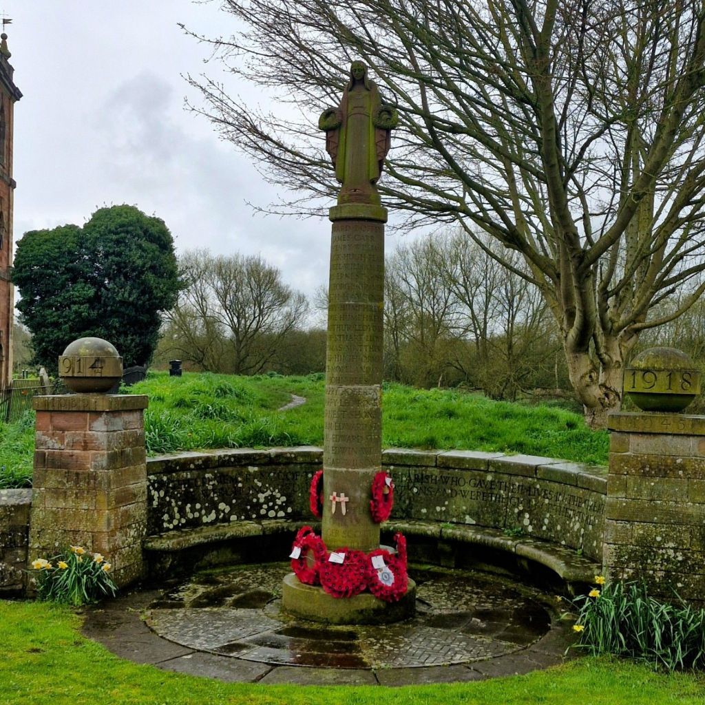 The village war memorial stands outside of St. Dunawd’s Parish Church, opposite the Royal Oak. It is made of Woolton red standstone and was sculpted by Herbert Tyson Smith in 1925. It is inscribed with the names of 23 local men who fell in the two world wars.