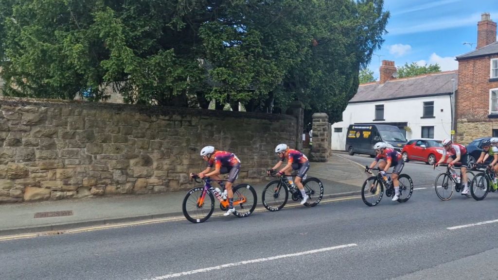 A few seconds later, the bunch, or peleton, zoomed by at high speed. There was no sign of anyone slowing down to take the downhill z-bend by the Vaults and Bridge End inns.