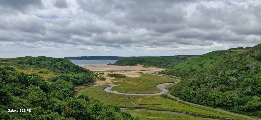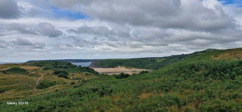 As we crested one of the many hills on the golf course, we caught our first view of Three Cliffs Bay.