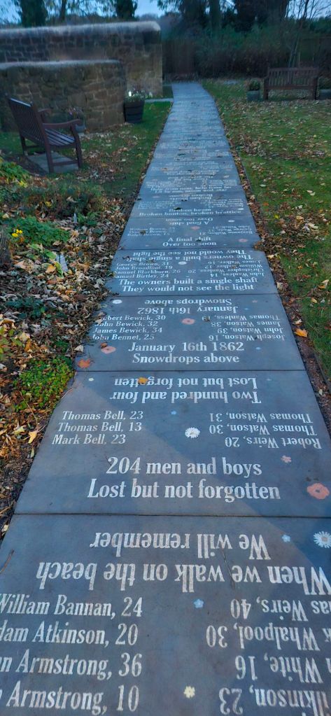 The garden is the site of the shaft to the Hester Pit. It’s a sad and solemn place. The path bears the name and age of all who died in the disaster. It is awful to see the number of families that were victims and the age of some of the boys is just as shocking. We paid our respects and returned back to Dave’s house.